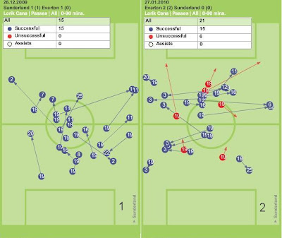 Bazen takımların kendilerinden güçlü ekiplere karşı oynadıkları maçlar Everton maçlarına bakarsak orta sahada yoğunlaşan pasların mesafesinin uzadığını görüyoruz. Buna rağmen ilginç bir şekilde topla buluşma sayısı Manchester United maçlarına göre daha az. İçeride oynadıkları ve 1-1'lik beraberlikle ayrıldıkları maçta Manchester United maçına benzer bir şekilde yay ve gerisinde topla buluşup verimli bir pas dağılımı yaparken